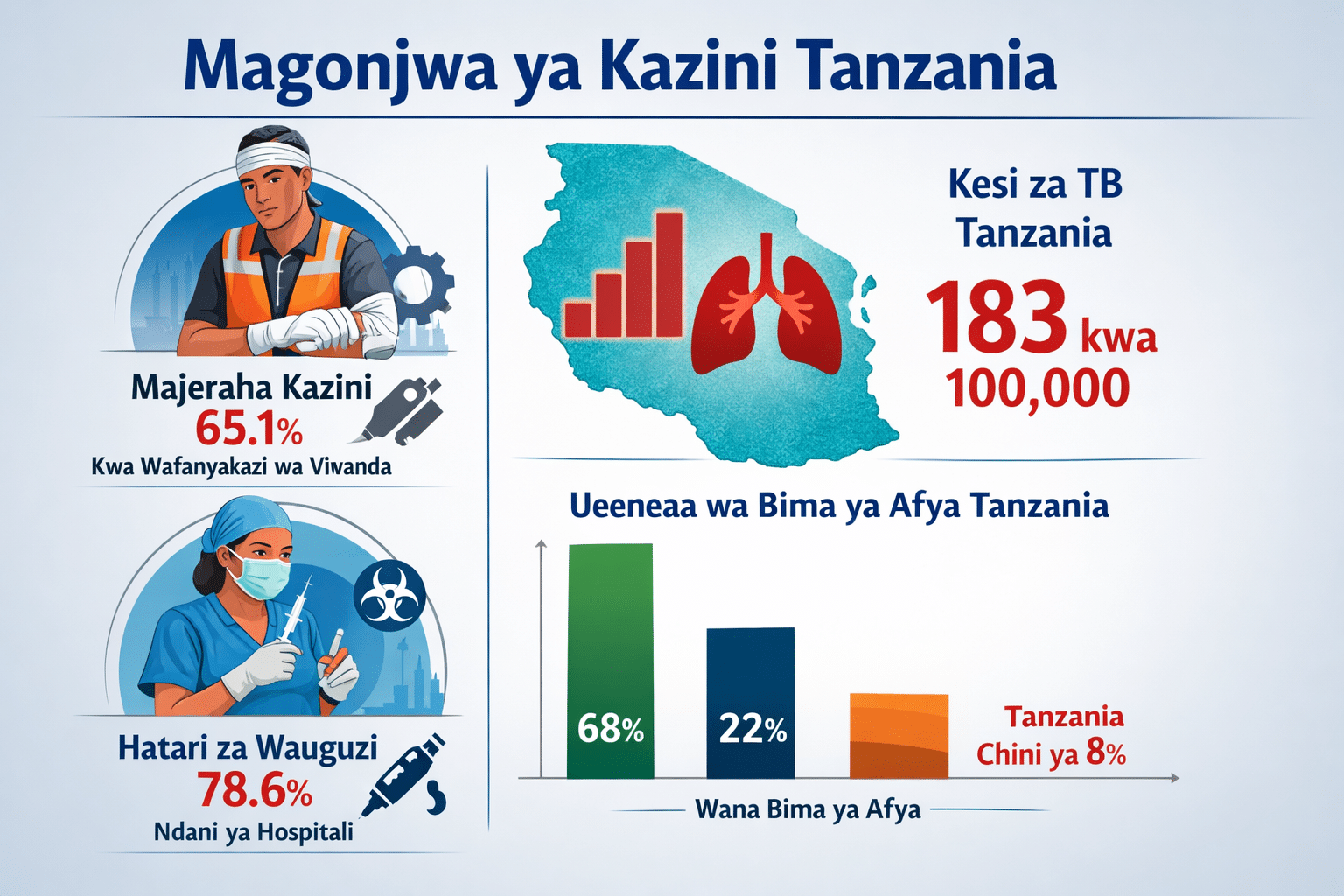 Katika sekta ya afya, tafiti zinaonyesha kuwa zaidi ya 78 % ya wauguzi katika Moshi Municipal walikumbana na hatari za kiafya mahususi ikiwemo jeraha kutokana na sindano (20 %) na mfiduo wa damu na mkojo (56.7 %), na karibu nusu ya waliokaguliwa walipata hatari hizo miaka moja iliyopita.